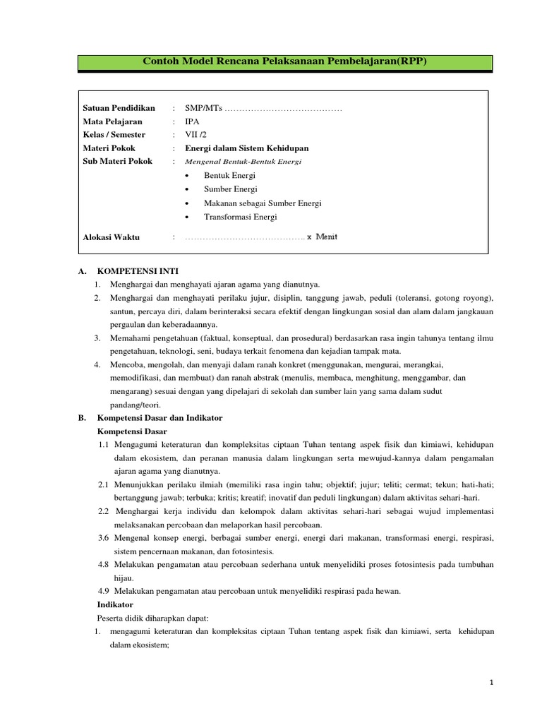 Rpp Ipa 7 Bab 1 Kp 1 Energi Dalam Sistem Kehidupan