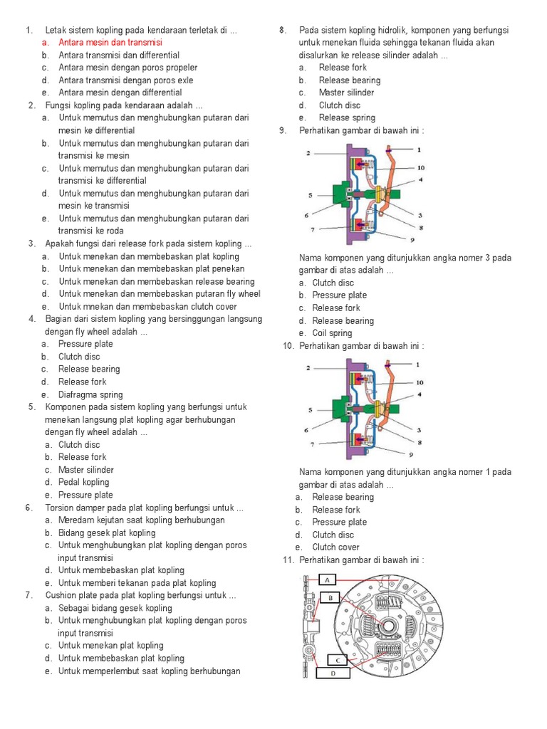 Soal Pilihan Ganda Sistem Kopling. Komponen kopling yang berfungsi untuk menyalurkan tenaga pembebas kopling. Keausan pada sambungan pengoperasian kopling c.