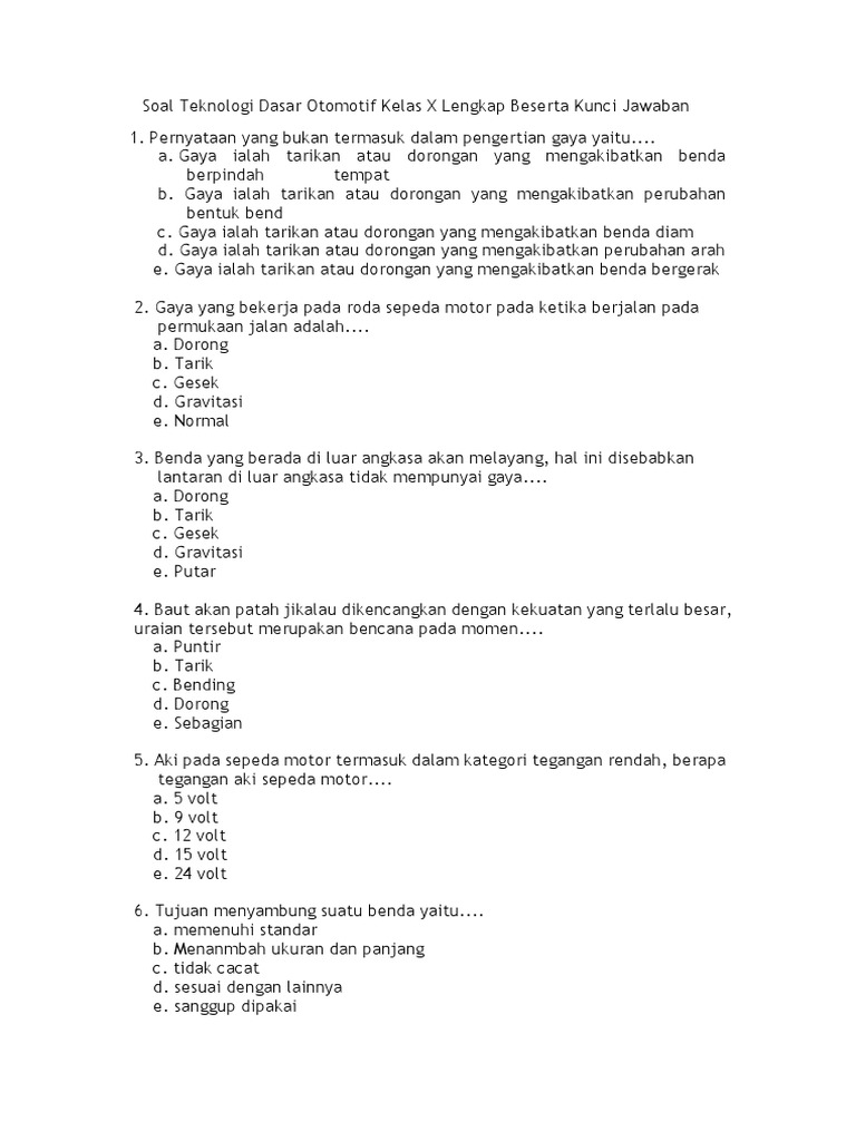Contoh Soal Teknologi Dasar Otomotif Docx. Artikel ini berisi soal pilihan ganda PDTO Kelas X Semester Genap. Teknologi Dan Rekayasa Program Keahlian.