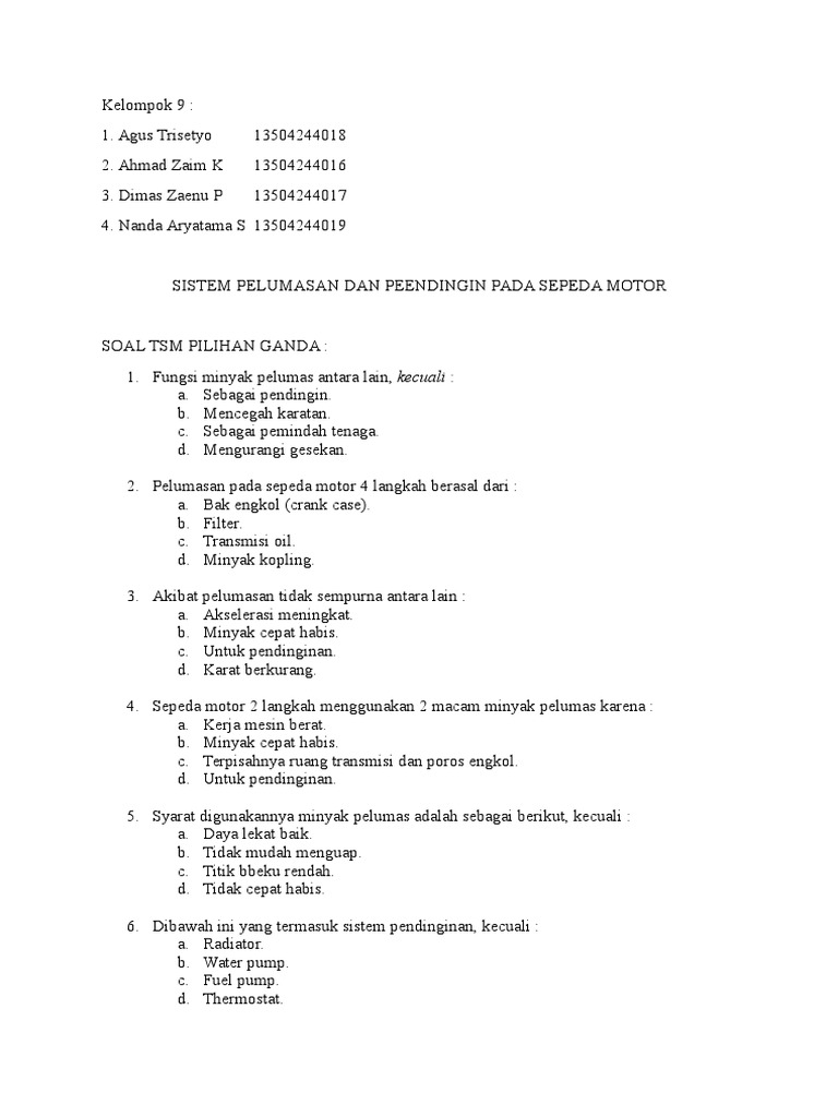 Soal Tsm Sistem Pendingin Dan Pelumas