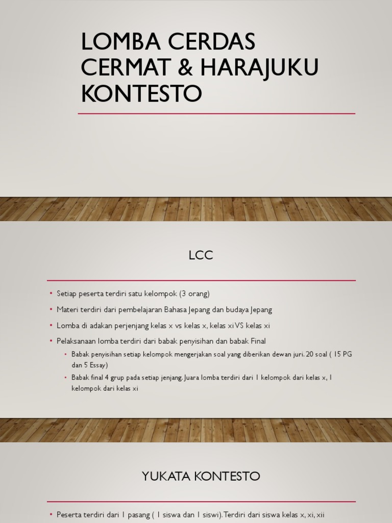 Babak Penyisihan Babak penyisihan LCC akan diadakan pada hari Sabtu 28 November 2015. Berapakah bentuk paling sederhana dari. Soal wajib lemparan dan rebutan dengan skor masing-masing.