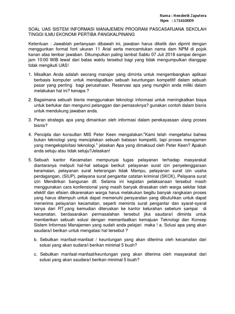 Soal Uas Sistem Informasi Manajemen Program Pascasarjana Sekolah Tinggi Ilmu Ekonomi Pertiba Pangkalpinang