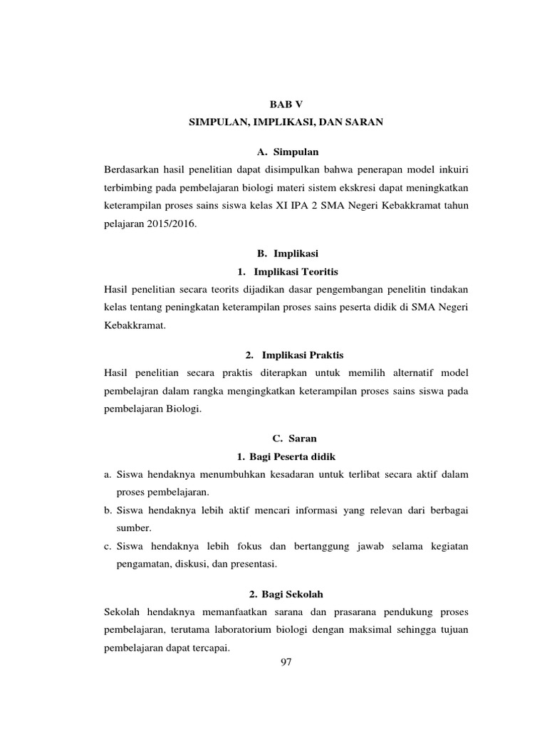 Penelitian ini bertujuan untuk menganalisis Keterampilan Proses Sains siswa kelas XI pada materi sistem ekskresi serta menganalisis kendala yang dialami siswa dalam menerapkan Keterampilan Proses Sains. 3 dan 5 2.