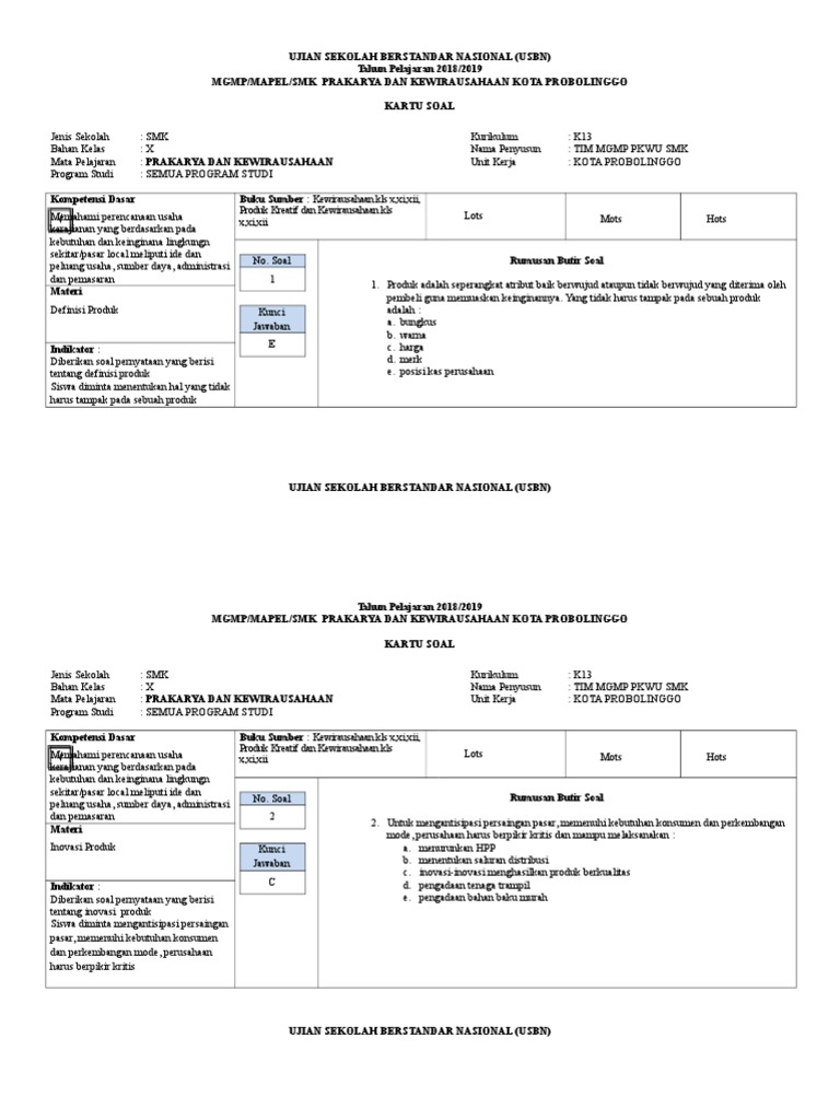 Modul Penyusunan Soal HOTS Prakarya dan Kewirausahaan. Download Soal USBN Prakarya dan Kewirausahaan 2019 PDF DOC Alhamdulillah pelaksanaan USBN 2019 mapel Prakarya Kewirausahaan sudah selesai.