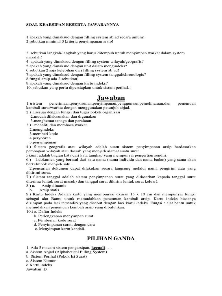 Soal Kearsipan Pilihan Berganda. Menyediakan tempat dan sarana perlengkapan arsip yang memadai. Analisis Sistem Kearsipan Di Kantor Kecamatan Gunungpati.