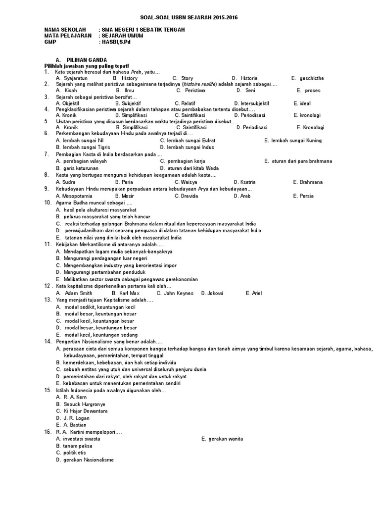 Kumpulan soal usbn sejarah peminatan.doc. Karena berdasarkan POS USBN kelulusan siswa peserta dari sekolah ditentukan juga oleh kelulusan dalam USBN. Download Soal Usbn Sejarah Dan Pembahasannya PDF 1800 MB - SamPDF Unduh Soal Usbn Sejarah Dan Pembahasannya PDF secara gratis di SamPDF. Jadi jangan lagi bilang geografi itu pelajaran sulit ya karena dengan banyak berlatih maka kamu akan semakin terbiasa.