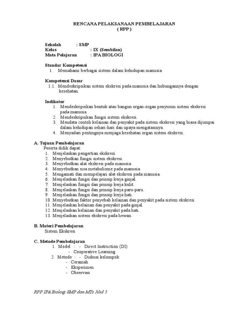 Rpp sistem ekskresi kelas 9 smp ktsp.