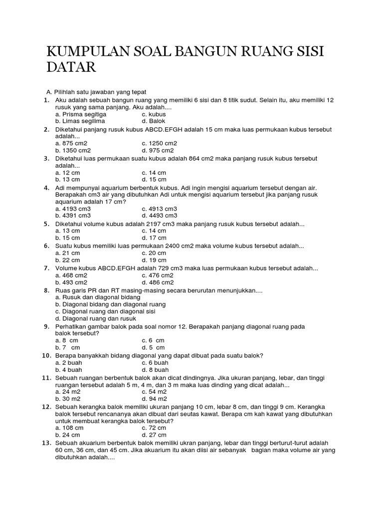 Soal bangun ruang datar.doc. Yuk ketahui mengenai bangun ruang dalam materi Belajar dari Rumah di TVRI. Download with Google Download with Facebook. BERILAH TANDA SILANG X PADA HURUF A B C ATAU D PADA JAWABAN YANG BENAR.