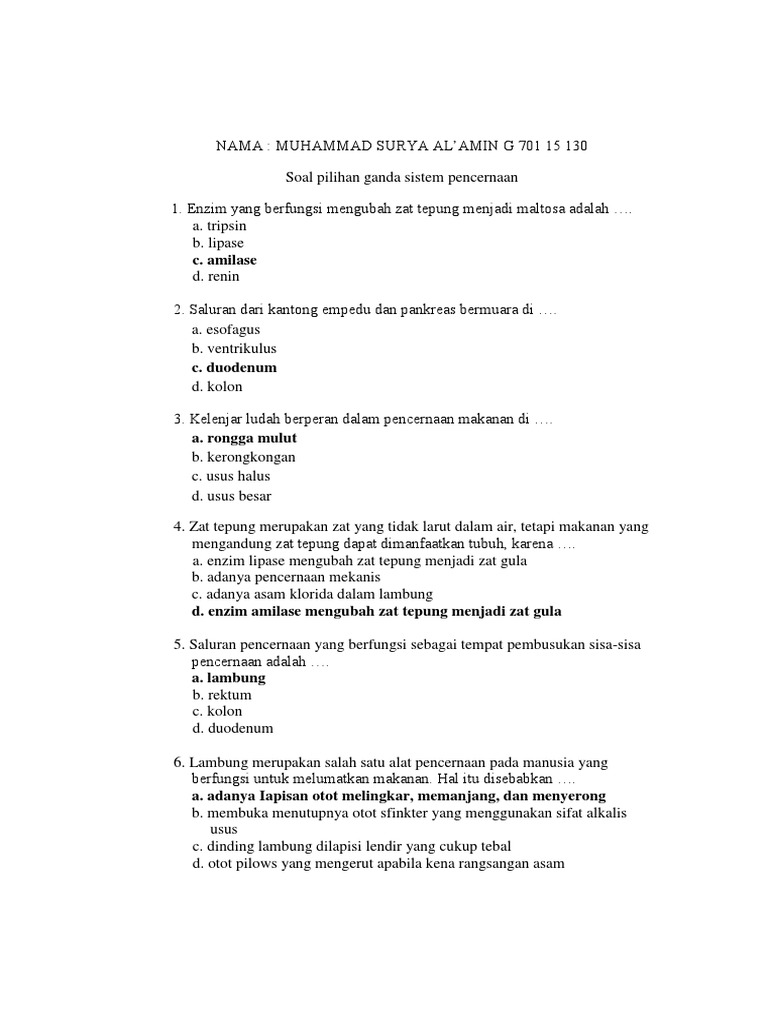 Soal Sistem Pencernaan Bagian 1. Semoga contoh Soal Pilihan Ganda Sistem Pencernaan Lengkap Dengan Pembahasannya ini bermanfaat banyak. Enzim yang dihasilkan oleh getah pankreas yang berfungsi untuk memecah amilum menjadi maltosa adalah Pembahasan.