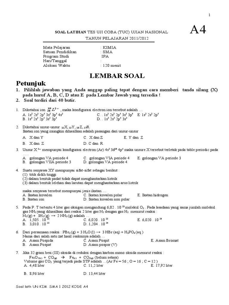 UN SMA IPA 2011 Kimia Kode Soal 999 Docname. Kisi-Kisi soal UNBK SMA MA MAK SMK 2018. UN SMA Kimia 2003.
