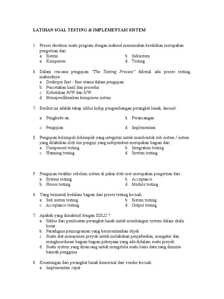 Soal pengujian dan implementasi sistem. Contoh soal dan jawaban materi testing dan implementasi sistem. Tugas Buat 30 Soal Jawaban PG. Testing dilakukan untuk memastikan atau menjaga mutu suatu produk.