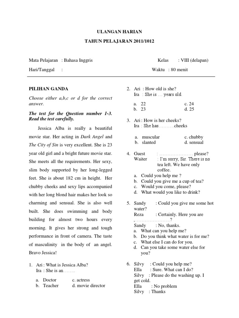 Soal UAS PAS Bahasa Inggris Kelas 8. 15 Soal Bahasa Inggris Kelas 8 SMP Semester 1 Materi Bahasa Inggris pada tingkat SMP terdiri dari pengenalan beberapa jenis teks struktur kalimat yang lebih kompleks kosakata dengan tingkatan yang lebih tinggi dan juga grammar yang lebih tinggi dari yang dipelajari saat sekolah dasar. K 13 Kompetensi Dasar.