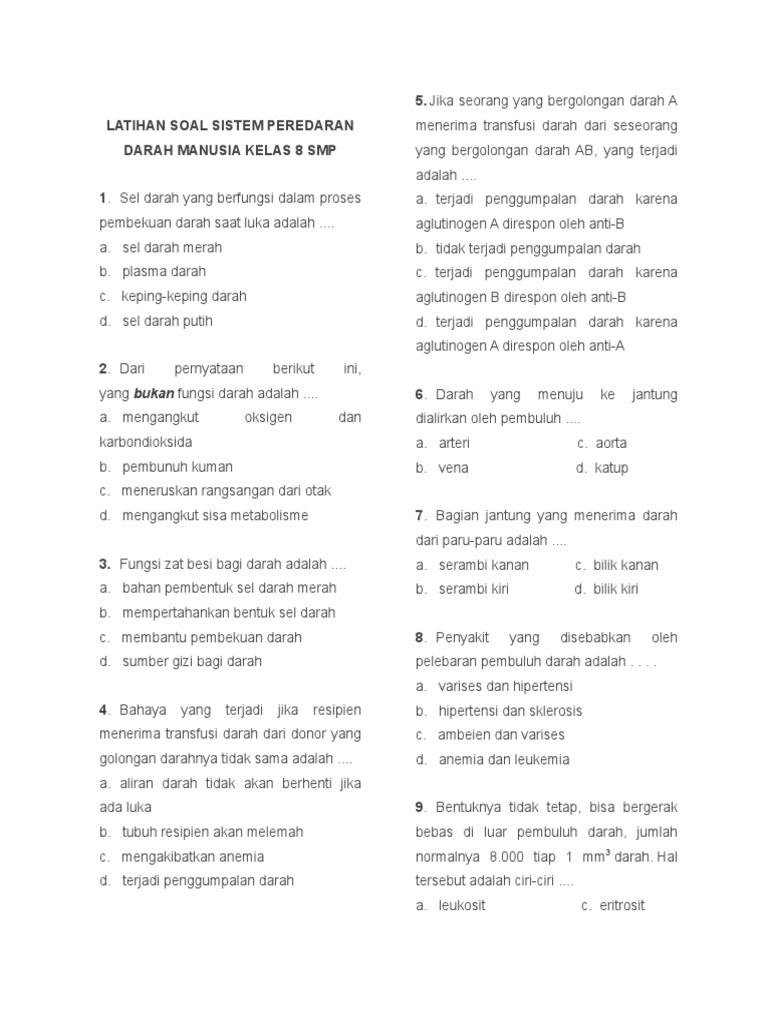 289464012 Latihan Soal Sistem Peredaran Darah Manusia Kelas 8 Smp Doc Doc