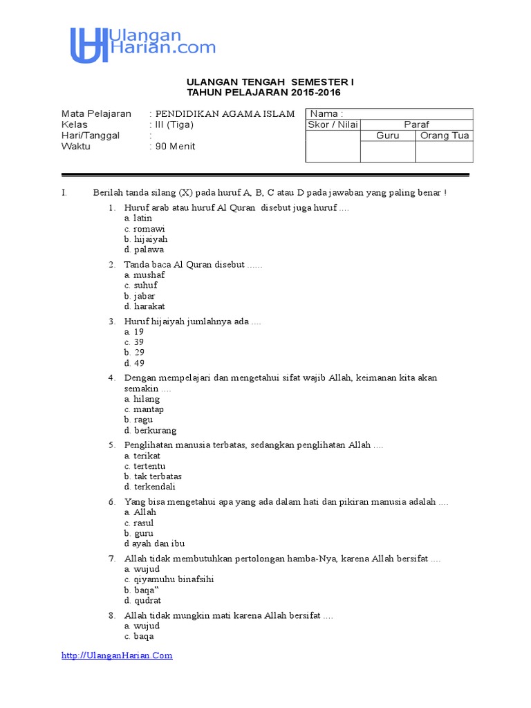 Soal Uts Pai Pendidikan Agama Islam Kelas 3 Semester 1 Tahun 2018 Juragan Les